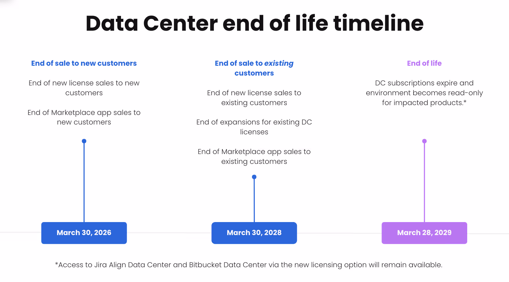 - March 30, 2026: Atlassian ends license sales for new customers. From this date forward, only existing customers with data center subscriptions can continue using and renewing DC.