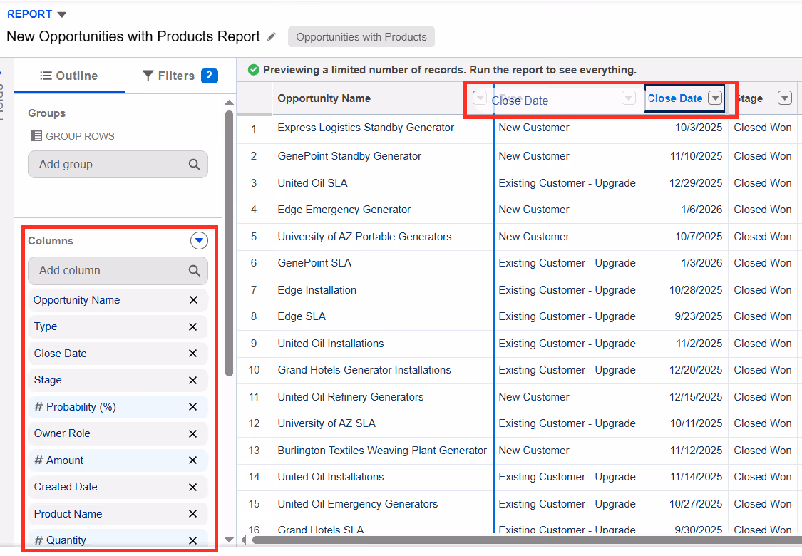 Salesforce reports offer flexible customization options. You can reorder columns either by dragging and dropping fields from the left-hand panel or by moving columns directly within the report preview. You can also easily add or remove columns as your reporting needs change.